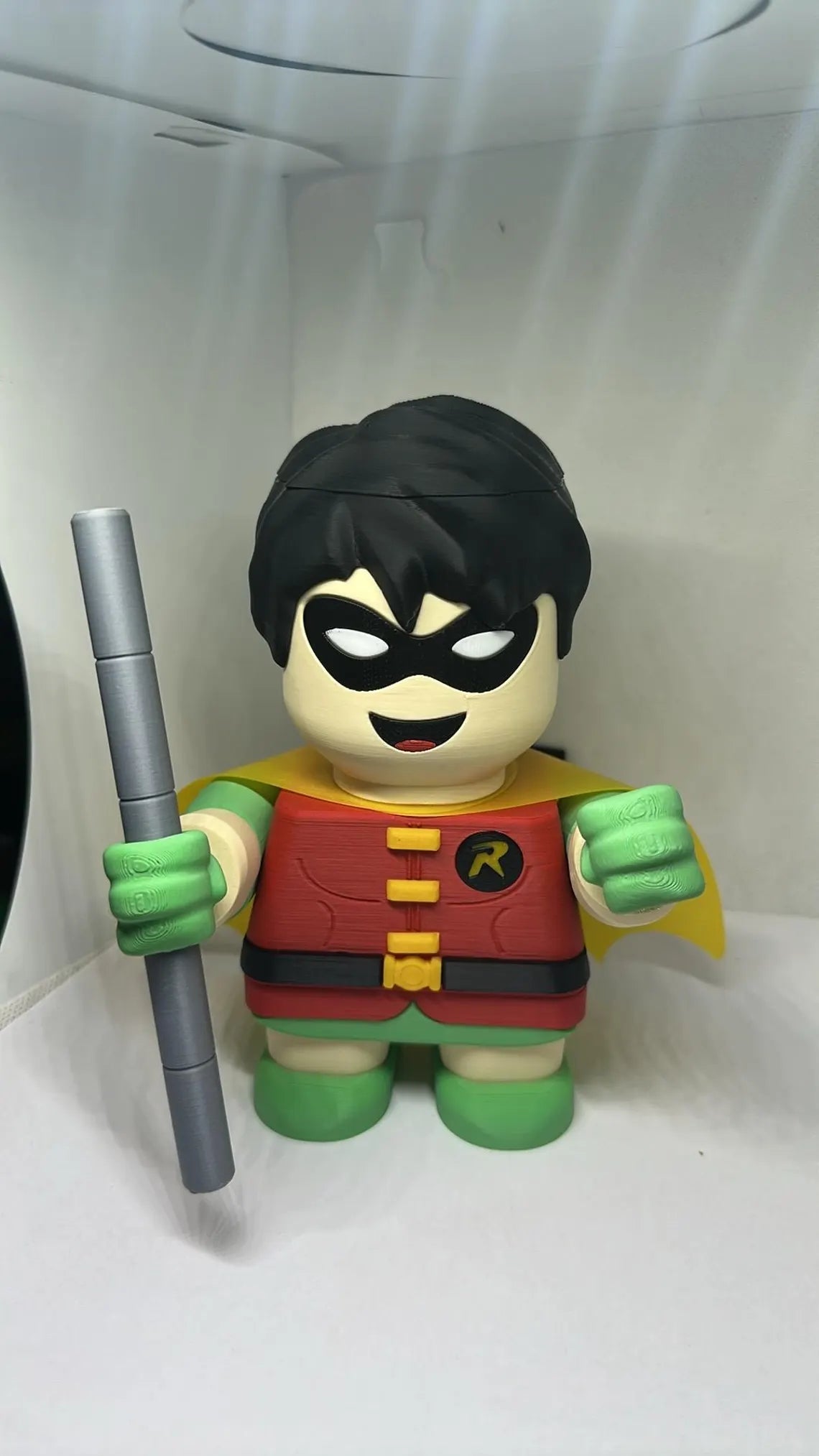 Straight from the Batcave comes this adorable 3D printed Robin figure, ready to bring some superhero fun to your shelf! Dressed in his iconic red, green, and yellow suit with his signature mask and staff, this chunky, stylized version of Robin is full of personality and perfect for any DC Comics or superhero fan.