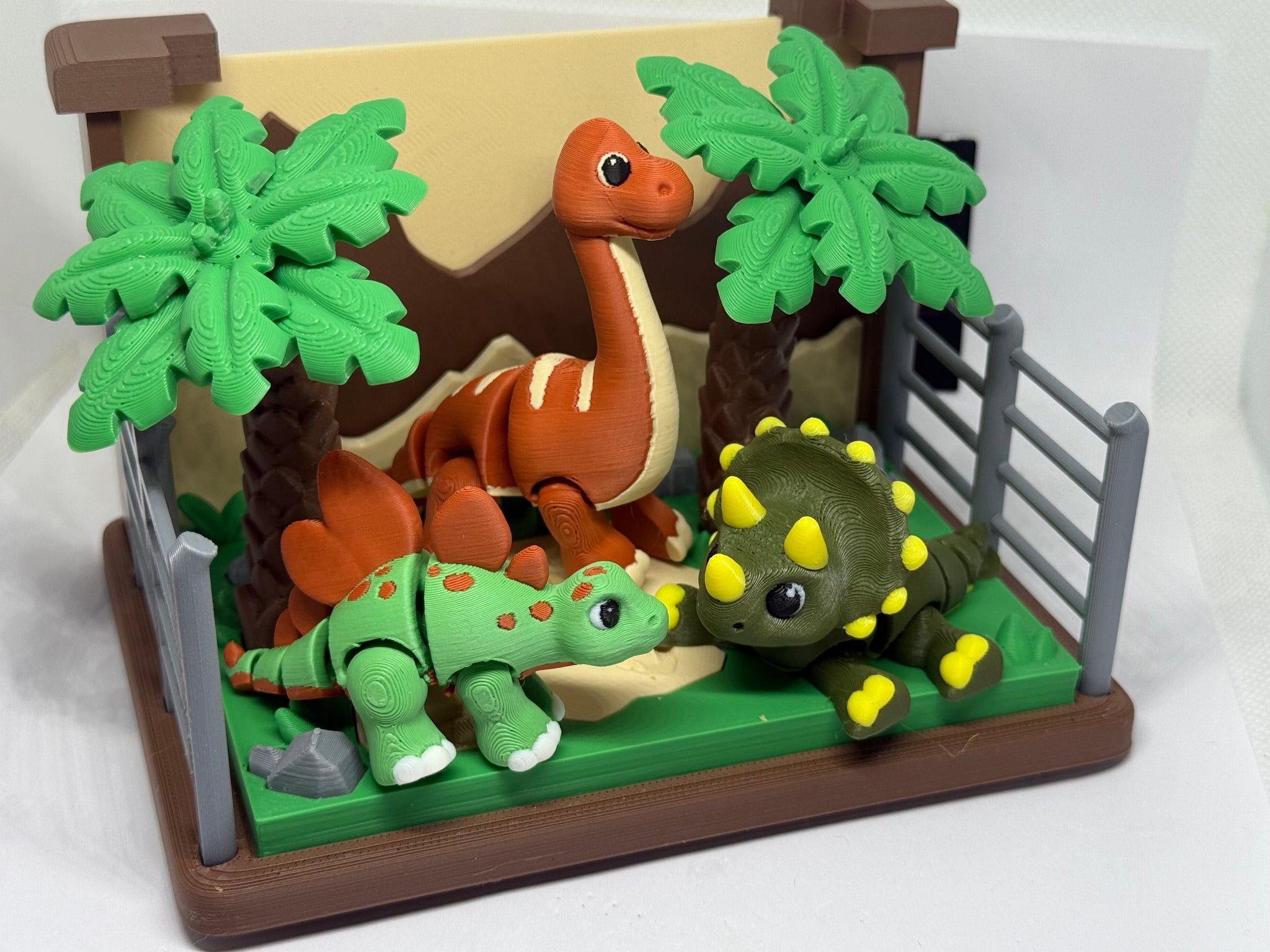 Bring prehistoric fun to life with this adorable 3D printed dinosaur playset! Featuring three colorful dinosaurs, palm trees, and a fenced base, this set is perfect for kids and collectors alike.