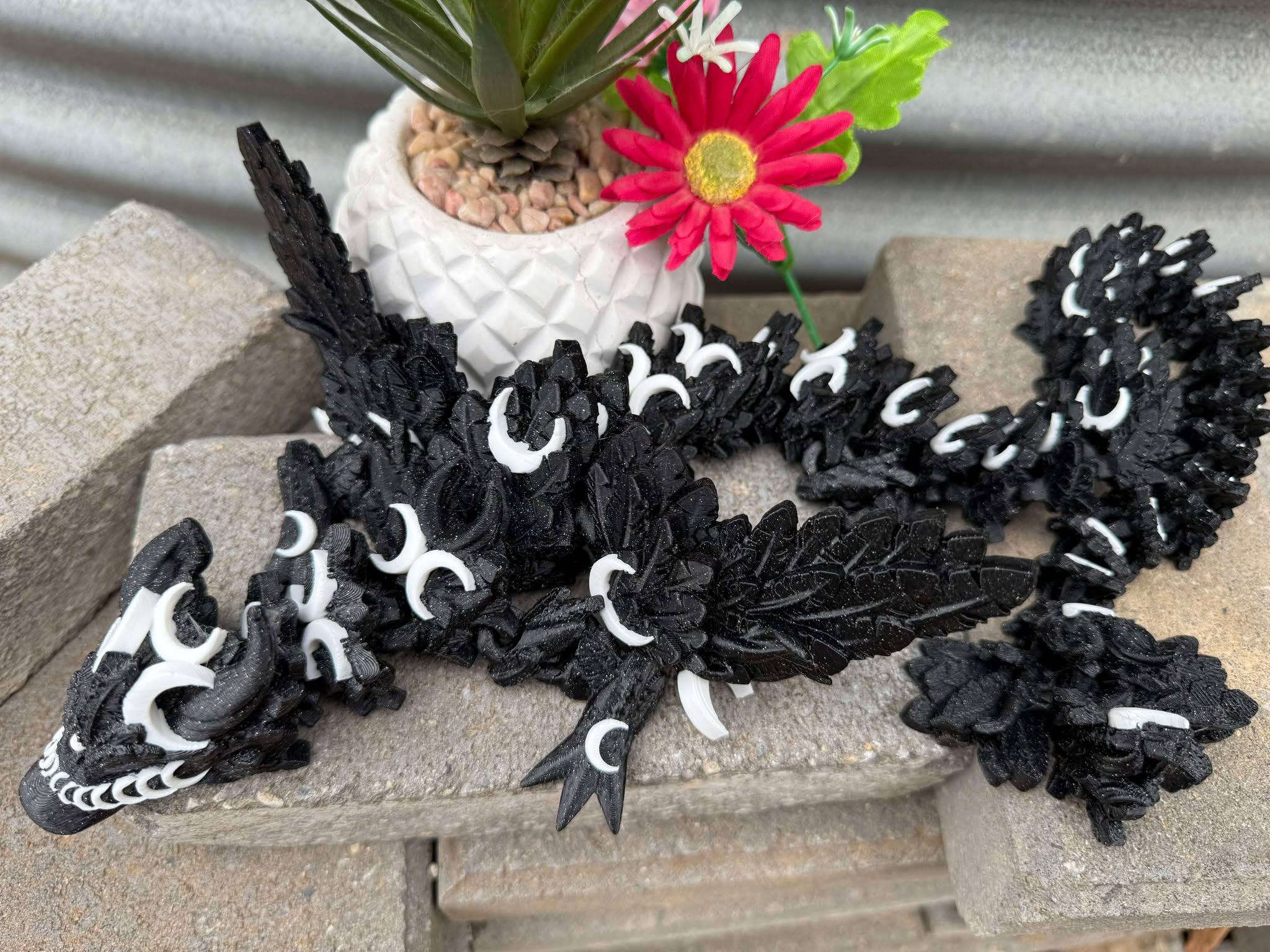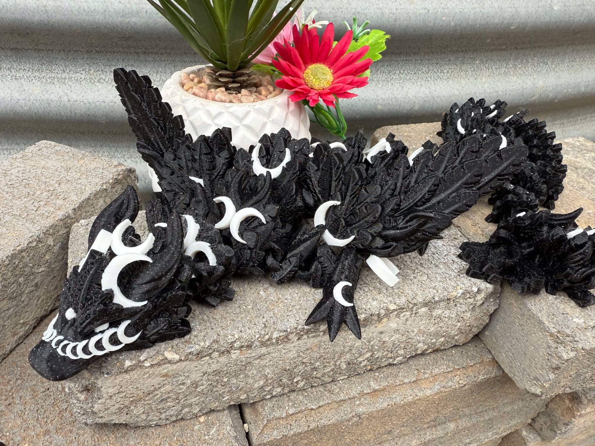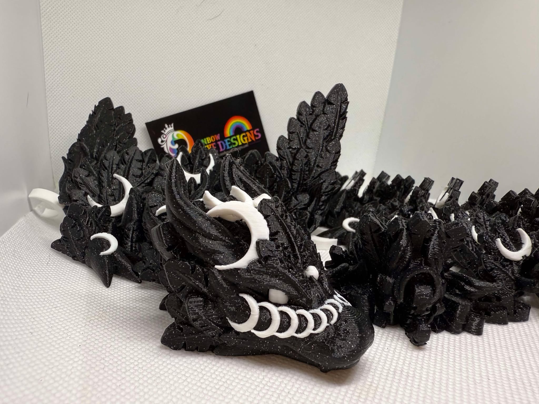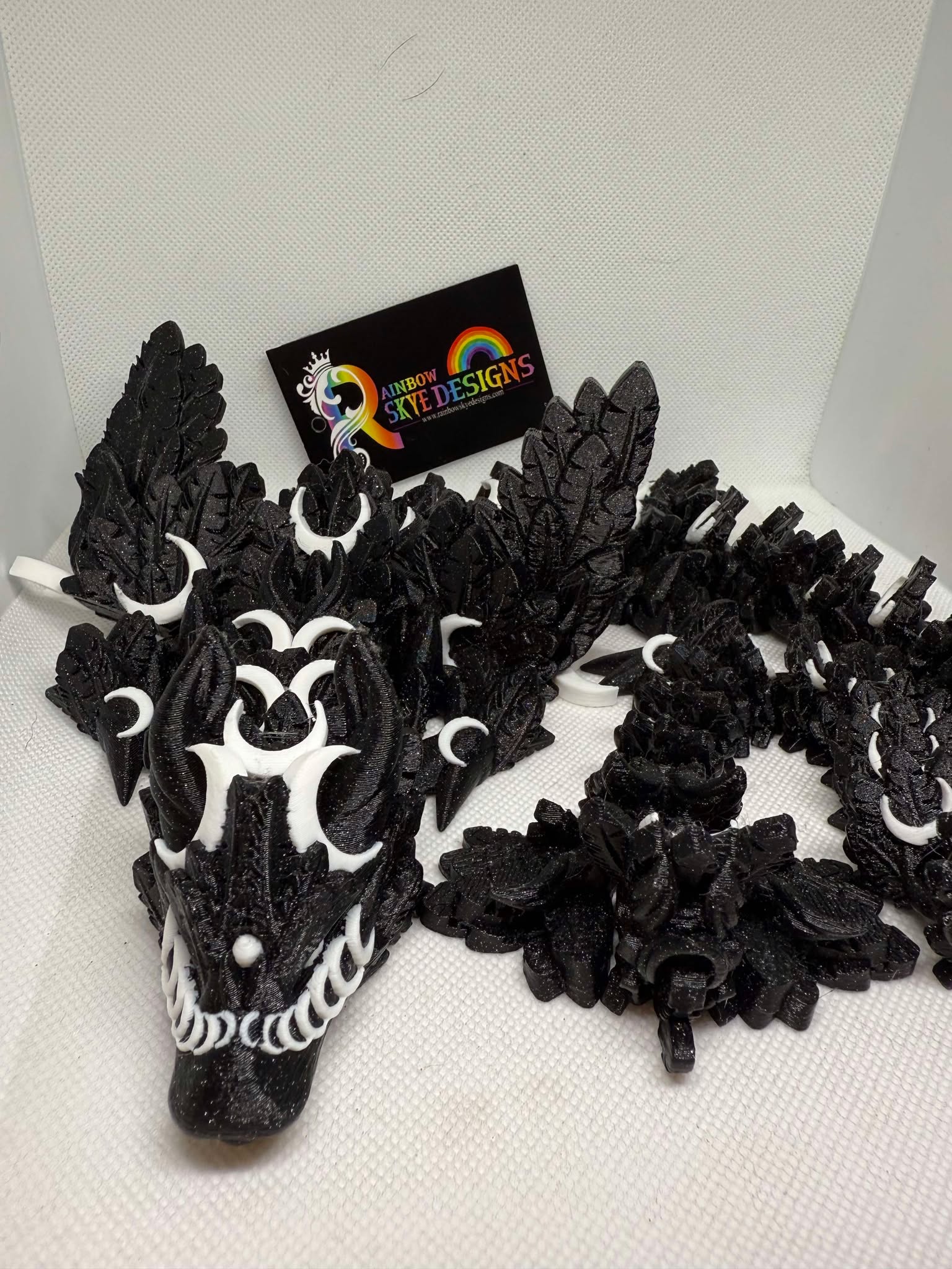 This adorable 3D printed Luna Dragon Has a sparkly Black Body which you can see in different lighting