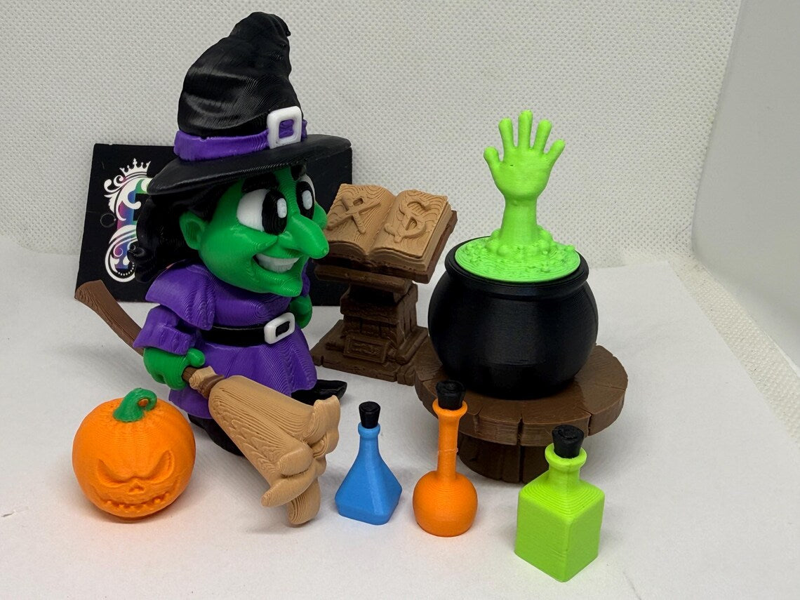 Bring a little Halloween magic to your home with this enchanting 3D printed Magic Witch Set. Shaped like a spellbook that opens to reveal a whole scene, this set is packed with spooky fun and charming details.