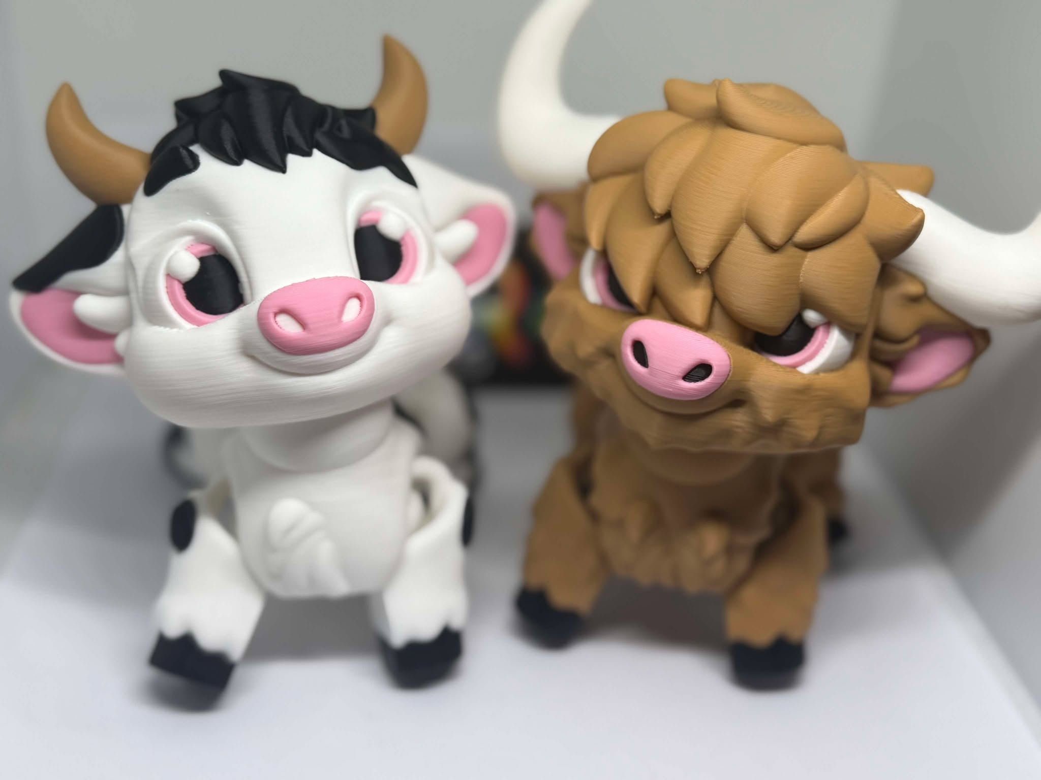 Bring charm and cuteness to your collection with these handcrafted 3D printed cow and Highland calf figures! Featuring oversized eyes, sweet smiles, and vibrant colors, each figure is carefully designed to melt hearts.