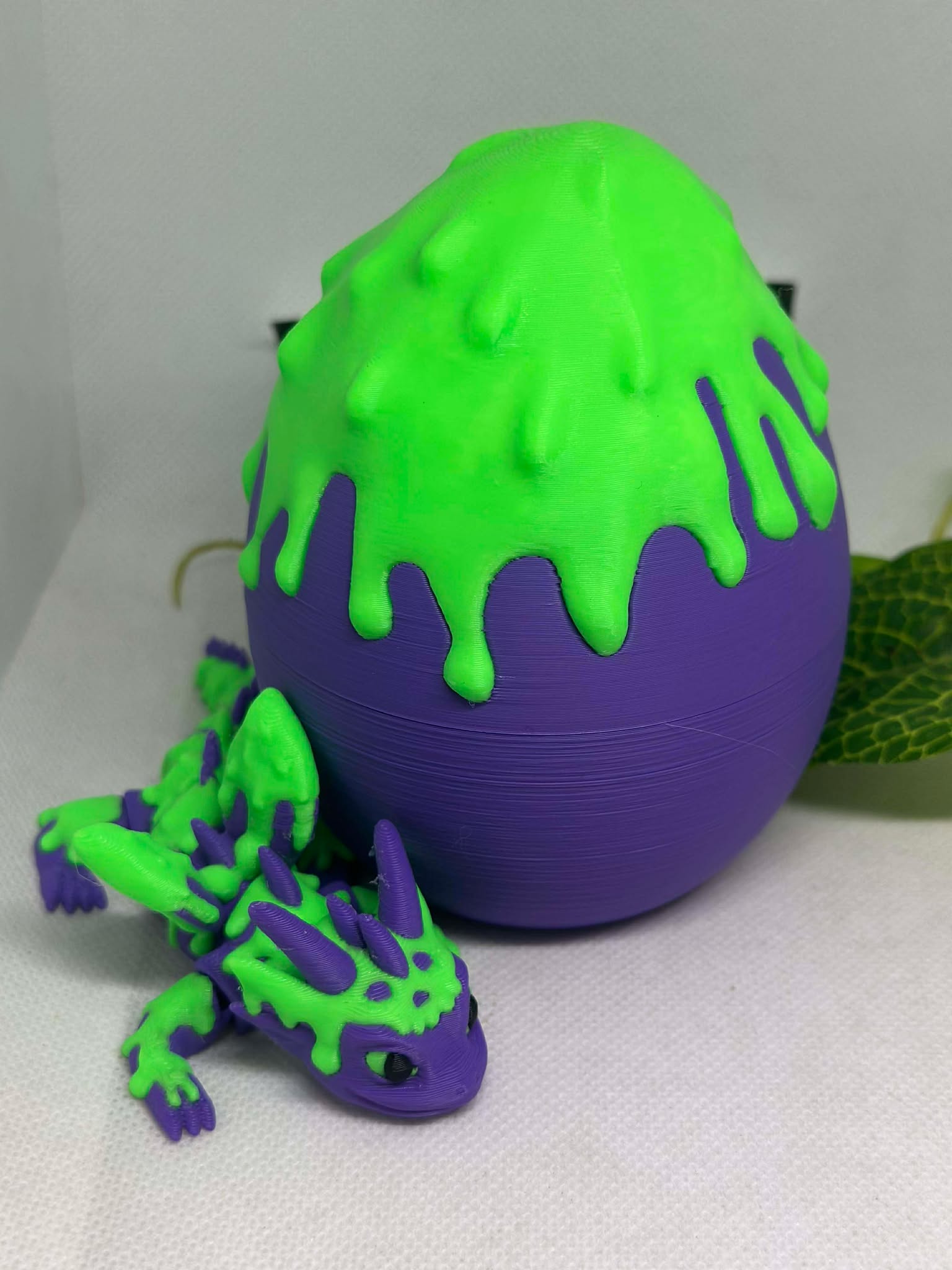 This fun fantasy set features a cute articulated slime dragon paired with a matching slime-drip βeggβ container with a removable lid, perfect for storing small goodies. With its bold purple base and bright neon green slime details, this piece has the perfect mix of cute, creepy, and cool. A real statement piece for desks, shelves, and display spaces!